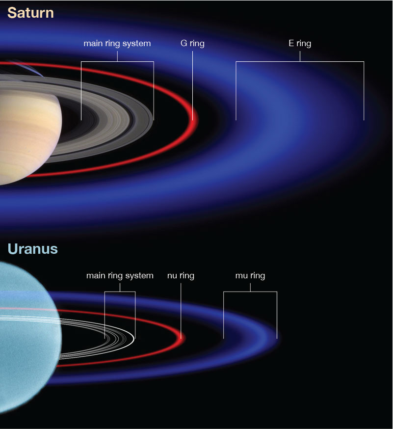 The team has just published the JWST findings, along with Keck observations of the nu and mu rings going back to 2007, in JGR Planets. The new JWST data demonstrate that the red nu ring is made of what we’d expect of particles knocked off ringmoons: a mixture of rocky and carbon-rich material with a wide range of grain sizes.